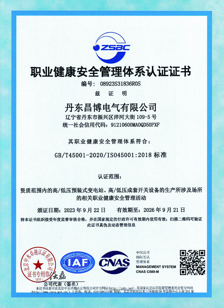 职业健康安全管理体系认证证书